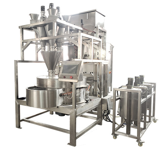 PLC自動化控制,原料、粉劑、料液自動補充,裹衣過程根據(jù)工藝改變添加參數(shù)及節(jié)奏,亦可根據(jù)粉劑種類的不同添加多個料筒,滿足了各類產(chǎn)品的工藝要求。密閉式結(jié)構(gòu),改善了傳統(tǒng)加工過程粉塵污染問題。一鍵式智能操作高度自動化,大大的減少了勞動強度和對工人裹衣技術(shù)的依賴;使裹衣質(zhì)量、均勻度不在受人為因素影響;實現(xiàn)了一人多機,高產(chǎn)量高質(zhì)量的自動化生產(chǎn)。